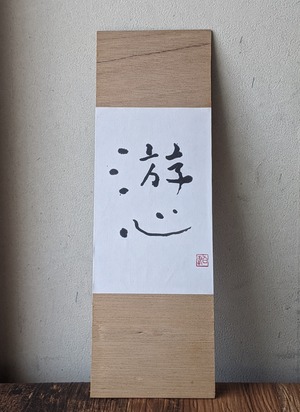 そして新しい試みというのが表具の仕方。墨が乾く過程で出来てしまう紙の皺を伸ばし、紙に厚みをもたせることを「裏打ち」といいます。そのおかげでピシッときまるのですが、今回は敢えて皺を残す(作る)ことで漆喰の壁紙のような雰囲気に致しますた。作品を貼り付けたパネル板、作品を乾かしたりする際に用いていたものでちょっと裏面に墨の跡とかがついています。今はなんとなくそういった古道具みたいなものが愛おしくてこの板を使わせて頂きました!そのこの少し時を経た雰囲気のパネルに合わせた裏打ちです。