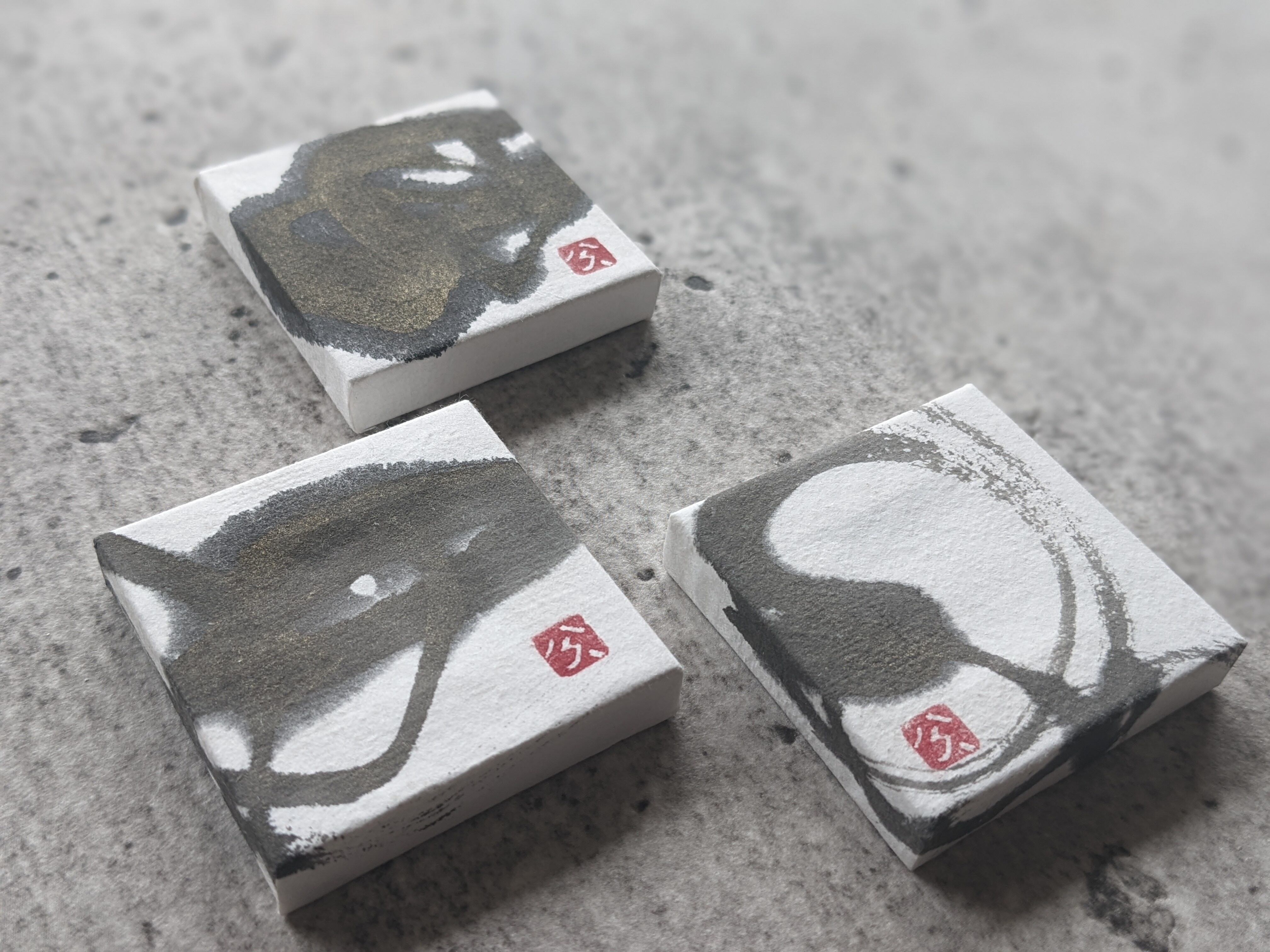 書家として日々膨大な数の紙に練習を致します。商品はこの練習をした紙で作ったオリジナルの袋を使い簡易包装でお送りいたします。エコに貢献するため、その点も弊店のオリジナリティーとご理解頂ければ幸いです。