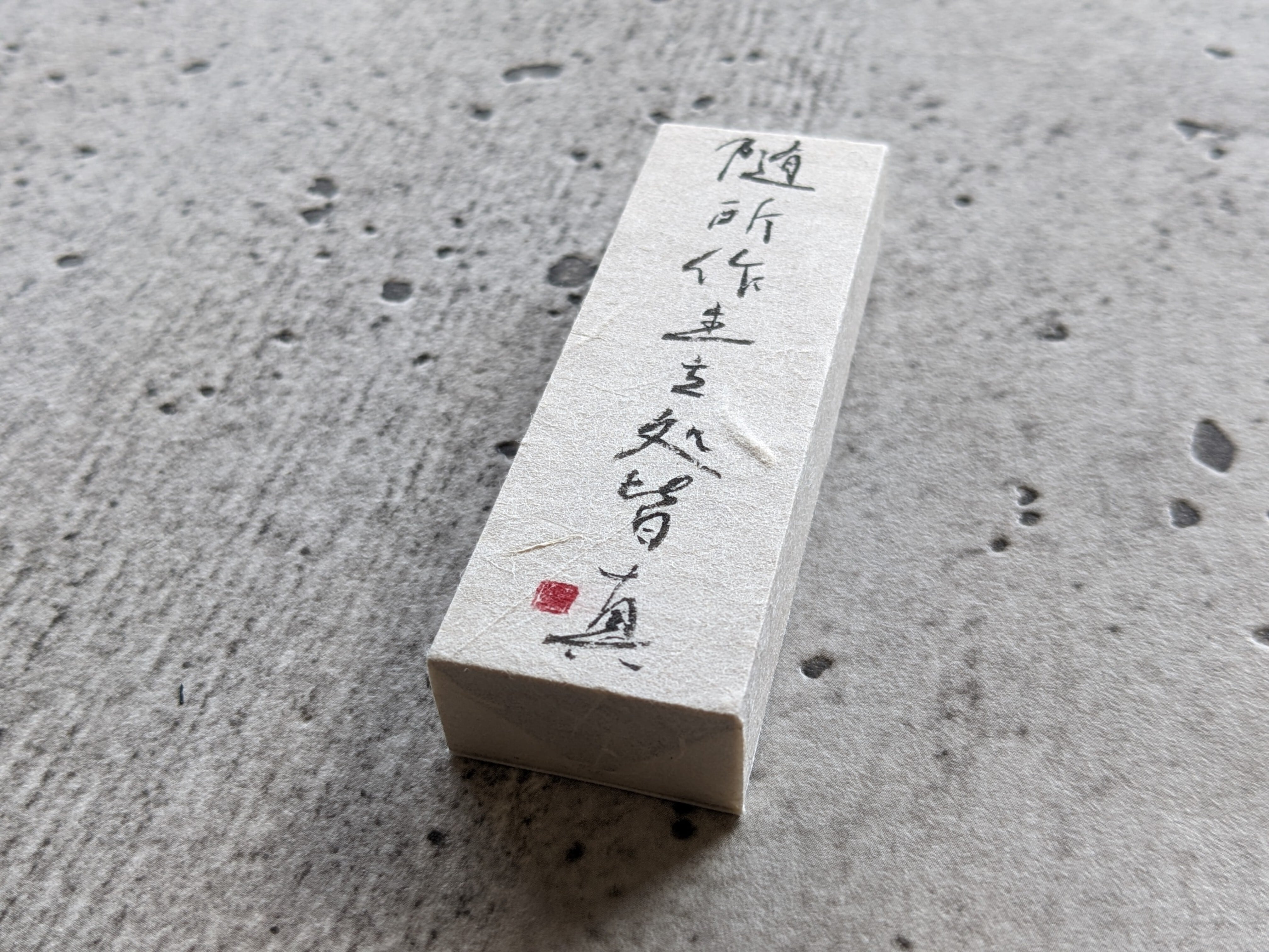 書家として日々膨大な数の紙に練習を致します。商品はこの練習をした紙で作ったオリジナルの袋を使い簡易包装でお送りいたします。エコに貢献するため、その点も弊店のオリジナリティーとご理解頂ければ幸いです。