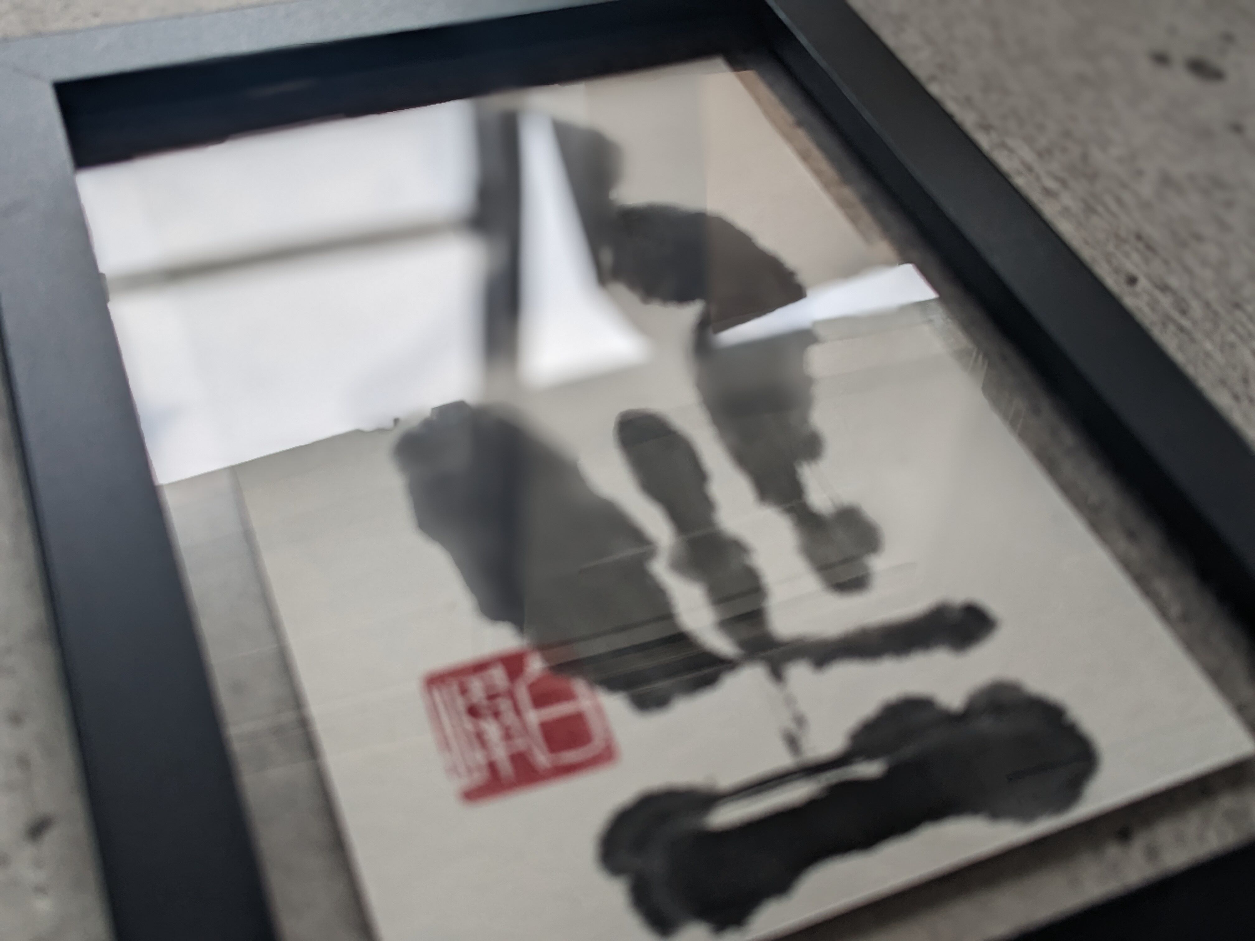 字を書く前に画仙紙に霧吹きで水を吹きかけ、おもしろい滲みがでるように仕上げました。