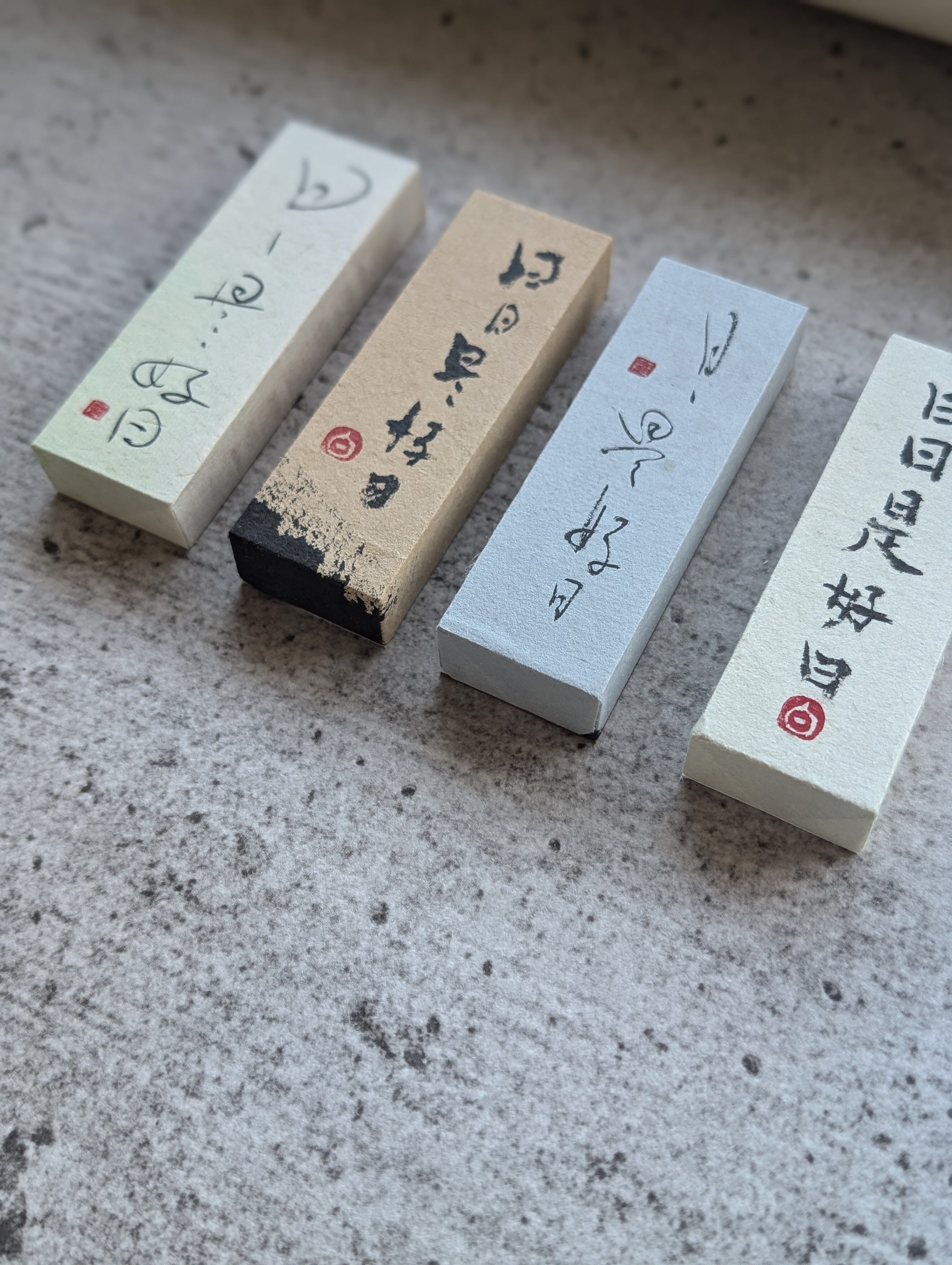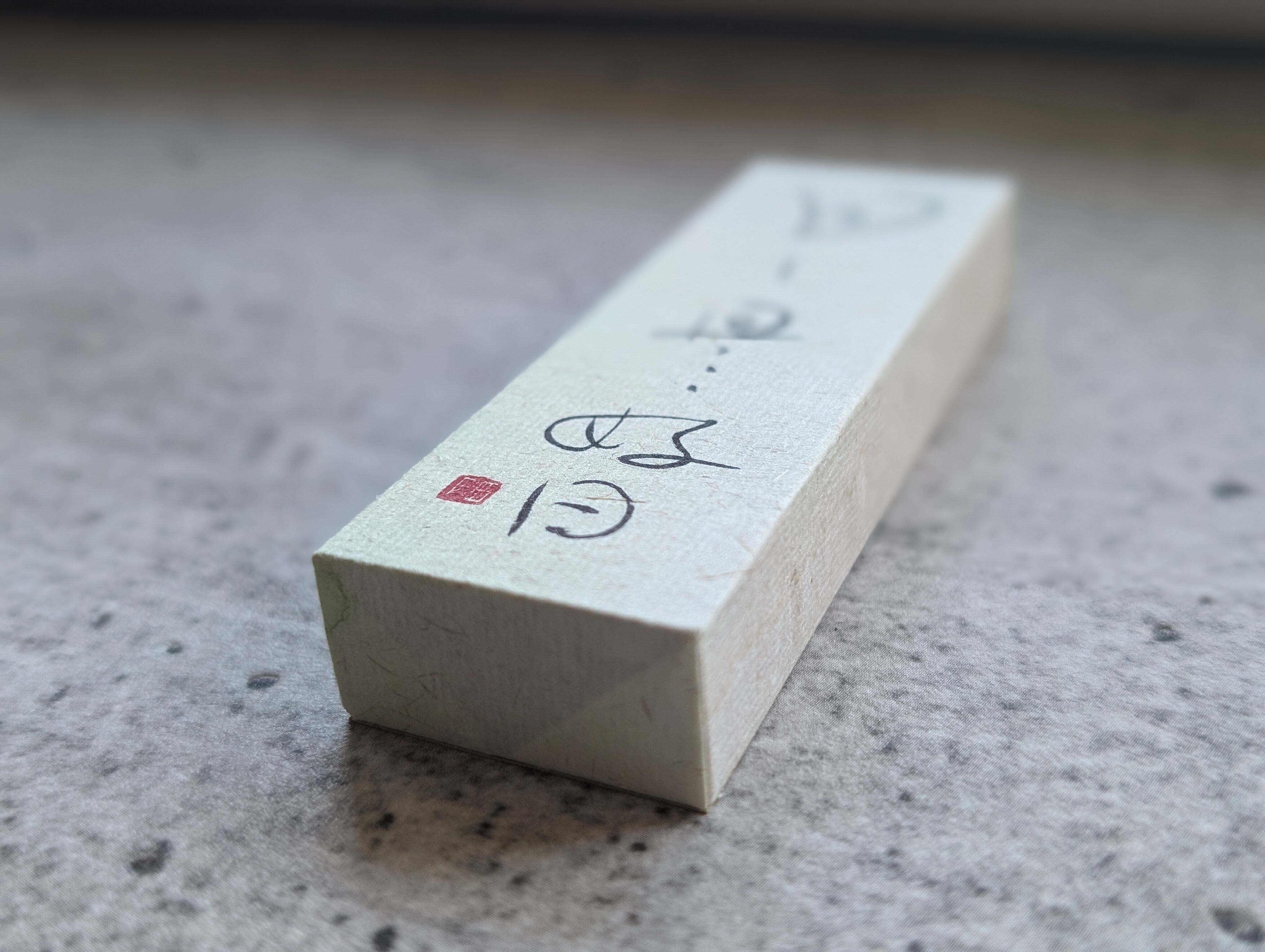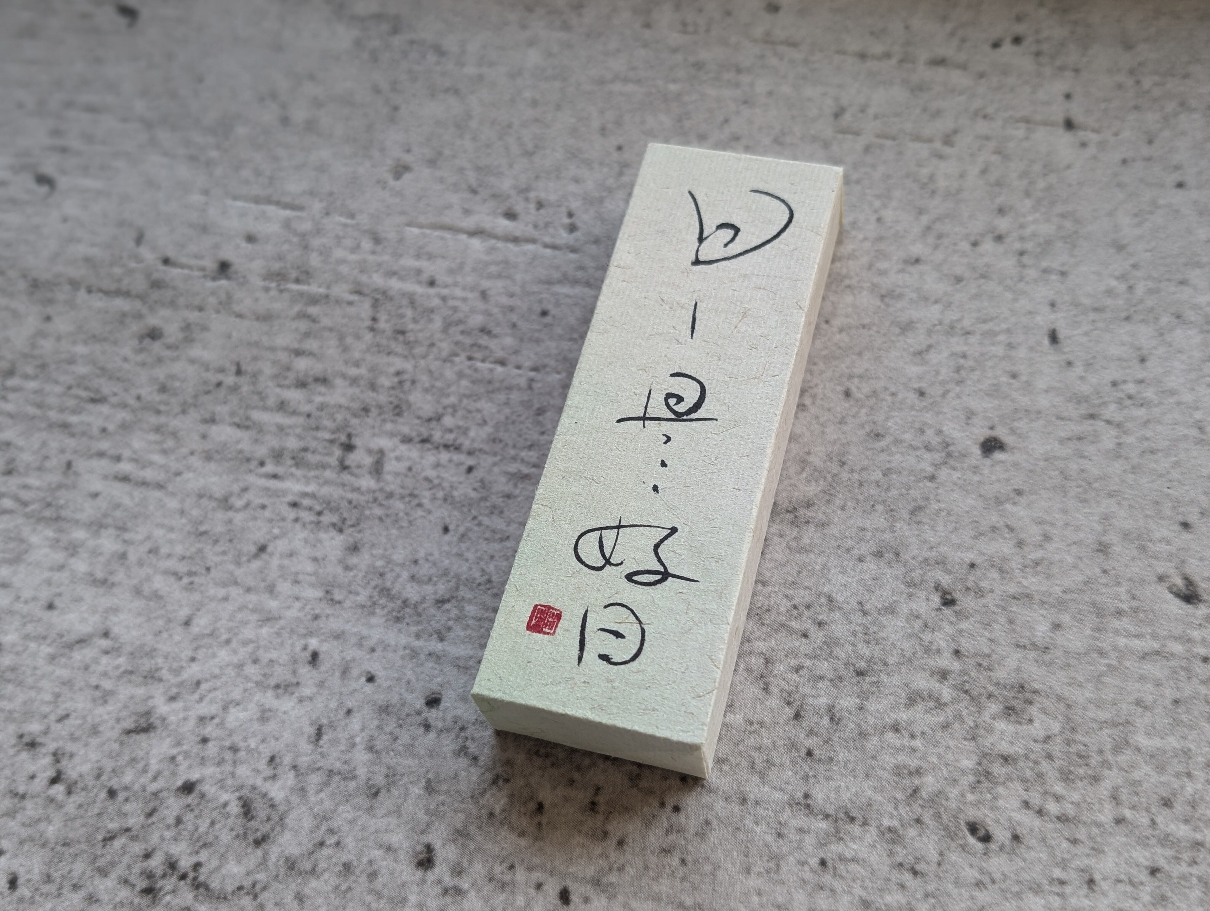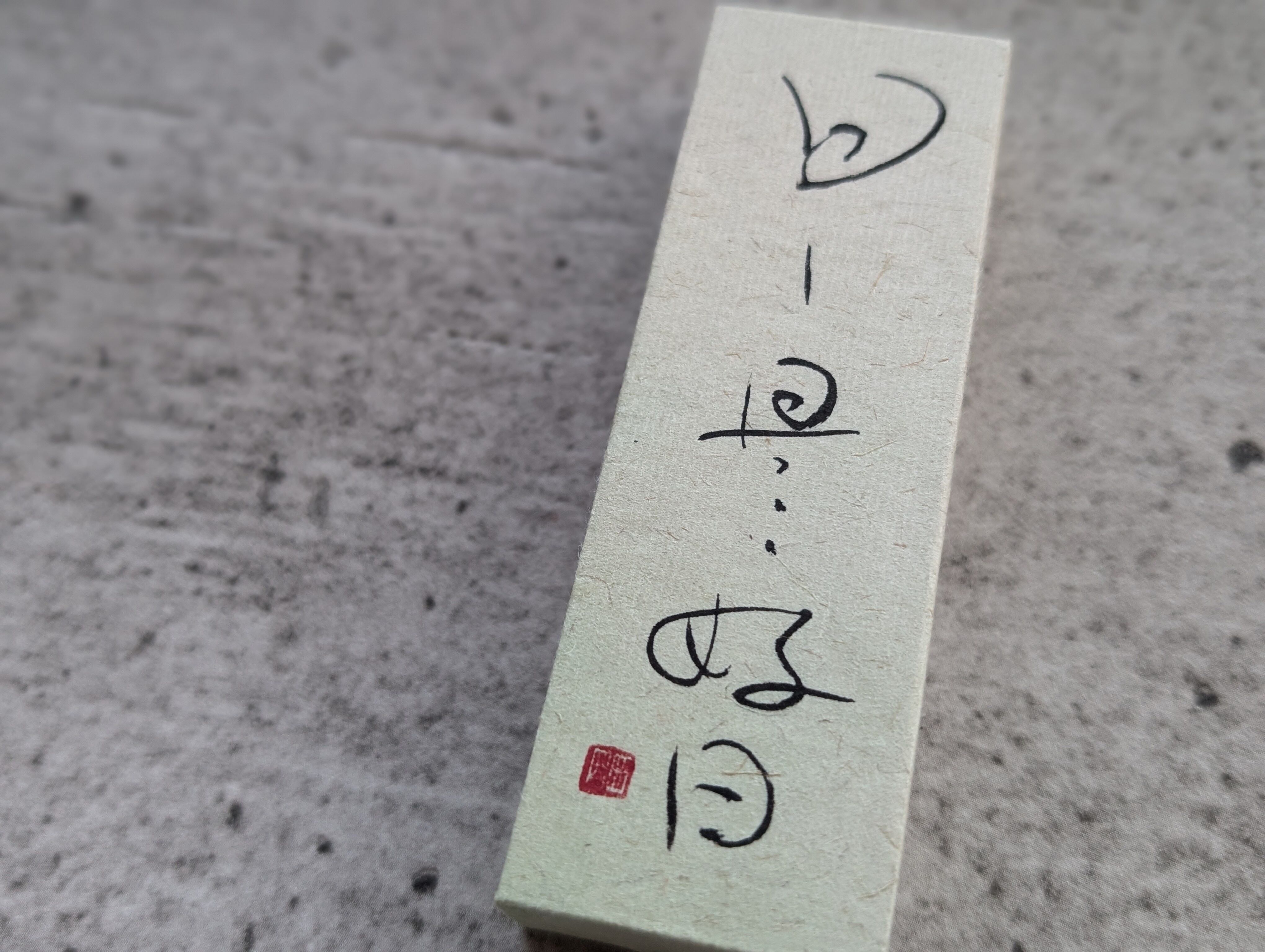 書家として日々膨大な数の紙に練習を致します。商品はこの練習をした紙で作ったオリジナルの袋を使い簡易包装でお送りいたします。エコに貢献するため、その点も弊店のオリジナリティーとご理解頂ければ幸いです。