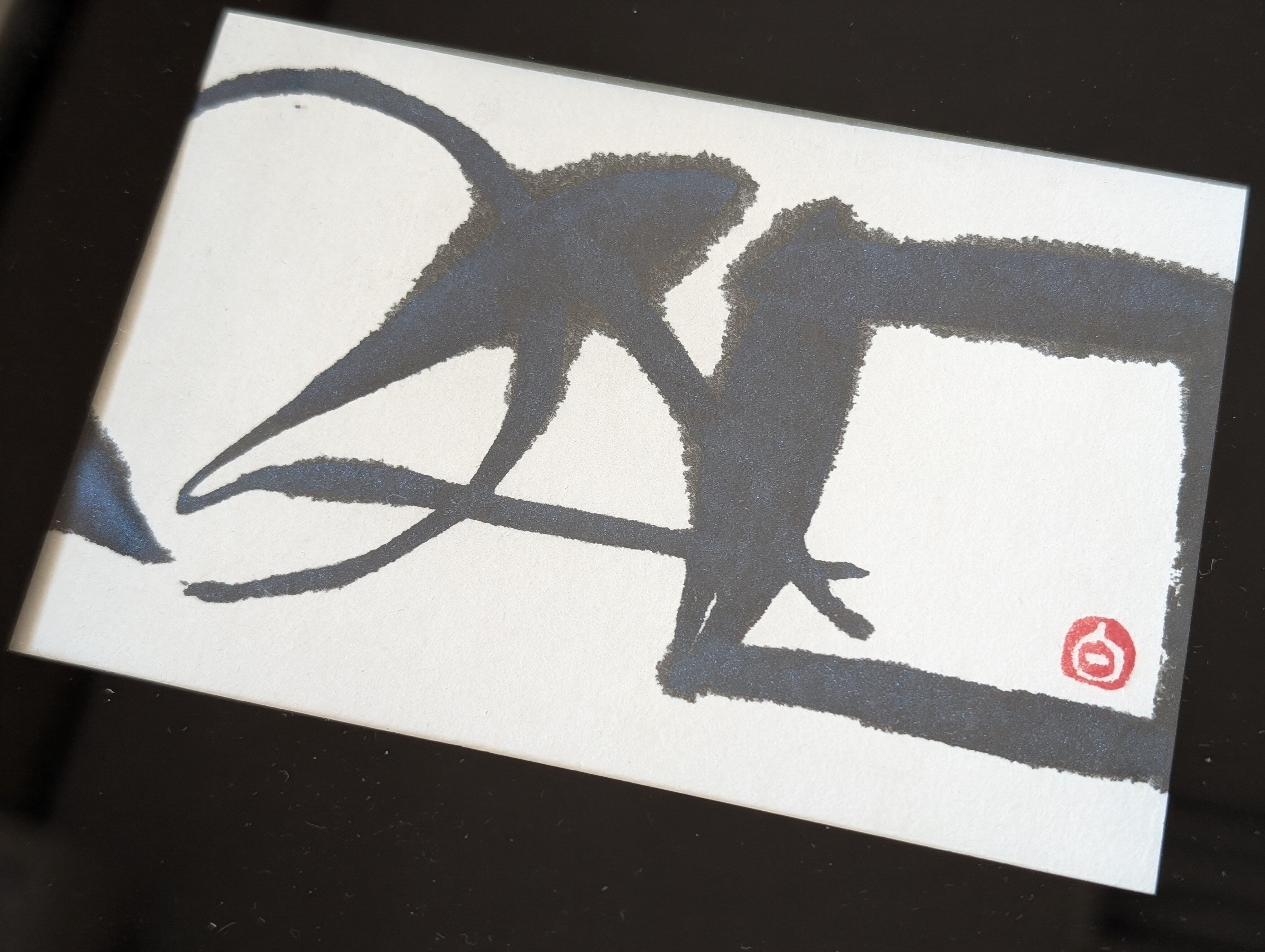 メタリックのブルーの墨を使っています。筆跡はブルーに、にじみは黒色に、そんな墨色の変化もお楽しみ頂けます。